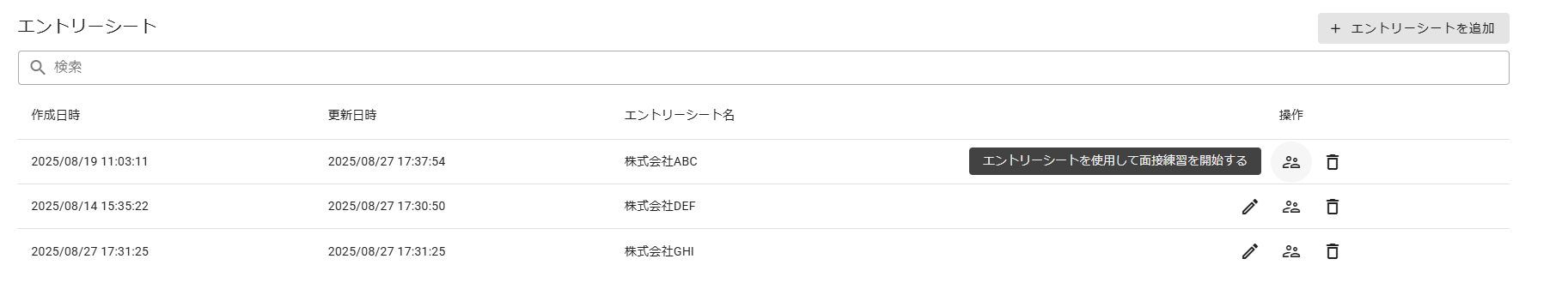 完成したESは企業ごとに一覧で保存されます。複数社の選考を並行する就活において、管理のしやすさは大きな強みです。